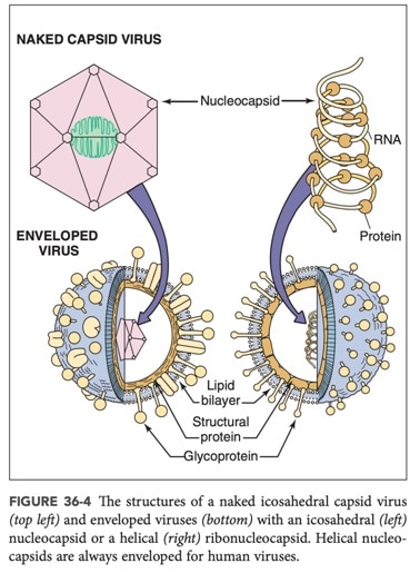 En les formes més simples, els virus consisteixen només en un àcid nucleic (DNA o RNA) envoltat d’una coberta proteica anomenada càpside. L’associació de la càpside amb l’àcid nucleic forma la nucleocàpsid. Aquesta nucleocàpsida és l’estructura que correspon a un virus nu. En altres casos, el virus està format per la nucleocàpsid i un embolcall compost de lípids, proteïnes i glicoproteïnes, estructura que correspon a un virus embolicat. Els virus embolicats adquireixen l’embolcall en sortir de la cèl·lula hoste per gemmació (Cooper, 2009).