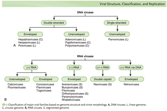El Comité Internacional de Taxonomía de los Virus es quien lleva a cabo su clasificación. Los criterios para definir una familia son el tipo de acido nucleico (RNA o DNA), estructura del genoma, mecanismos y lugar de replicación, presencia o no de envoltura, simetría de la cápside (helicoidal, icosaédrica o compleja), lugar de ensamble de las partículas virales (núcleo o citoplasma) y forma de salida de la célula hospedadora (Carballal G et al., 2014).